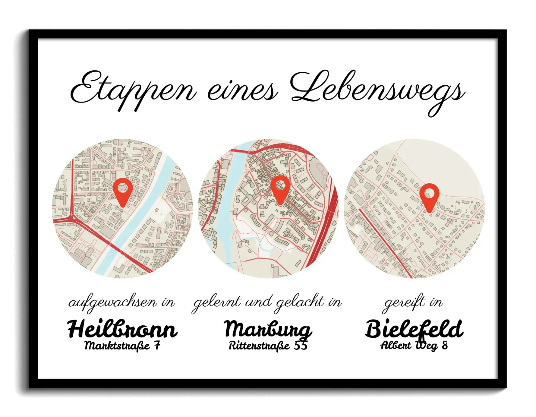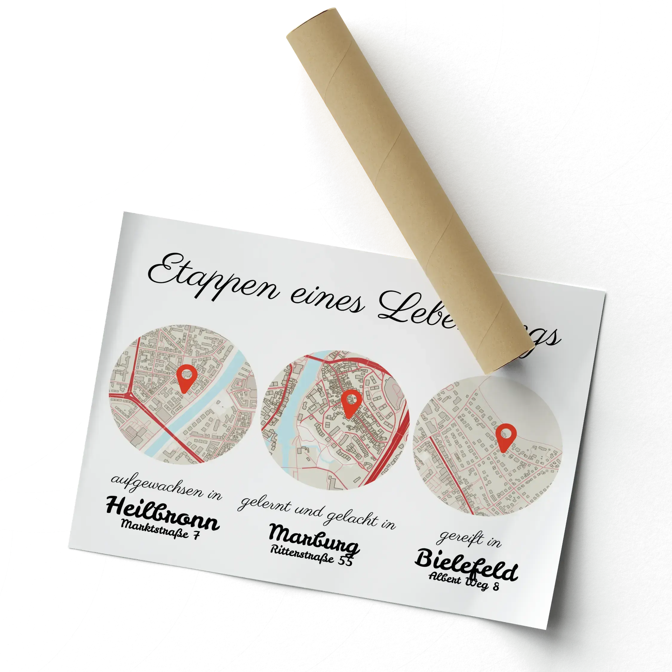 Starte jetzt mit der Erstellung deiner individuellen Lebensweg-Karte und verewige drei markante Lebensphasen: Deine Kindheit und Jugend, deine Ausbildungs- und Studienzeit sowie deine berufliche und persönliche Entwicklung.