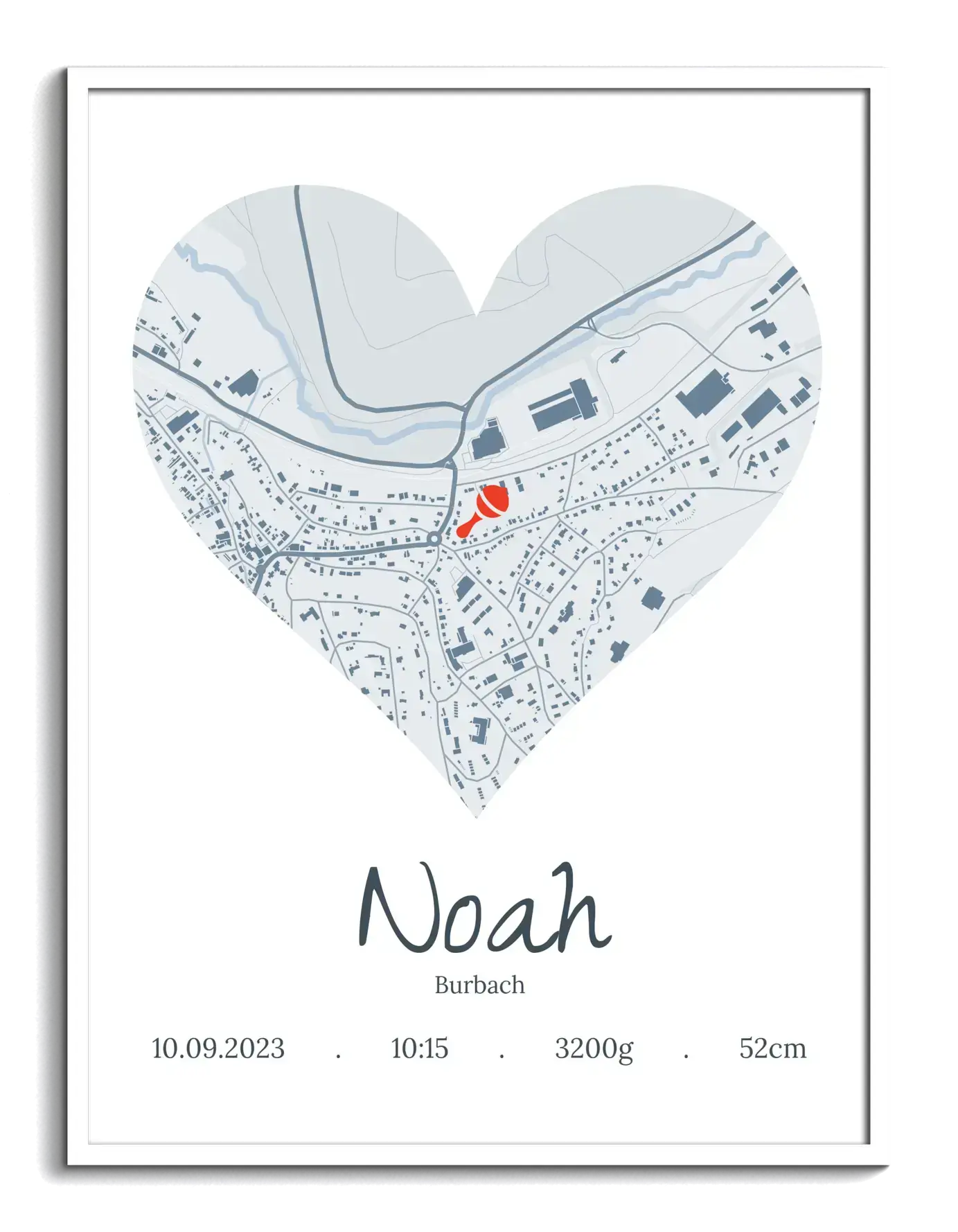 Geschenk zur Geburt: Posterdruck mit Stadtkarte, Koordinaten Namen, Ort, Gewicht und Größe des Kindes. Druck als gerahmtes Poster oder JPG-Download.
