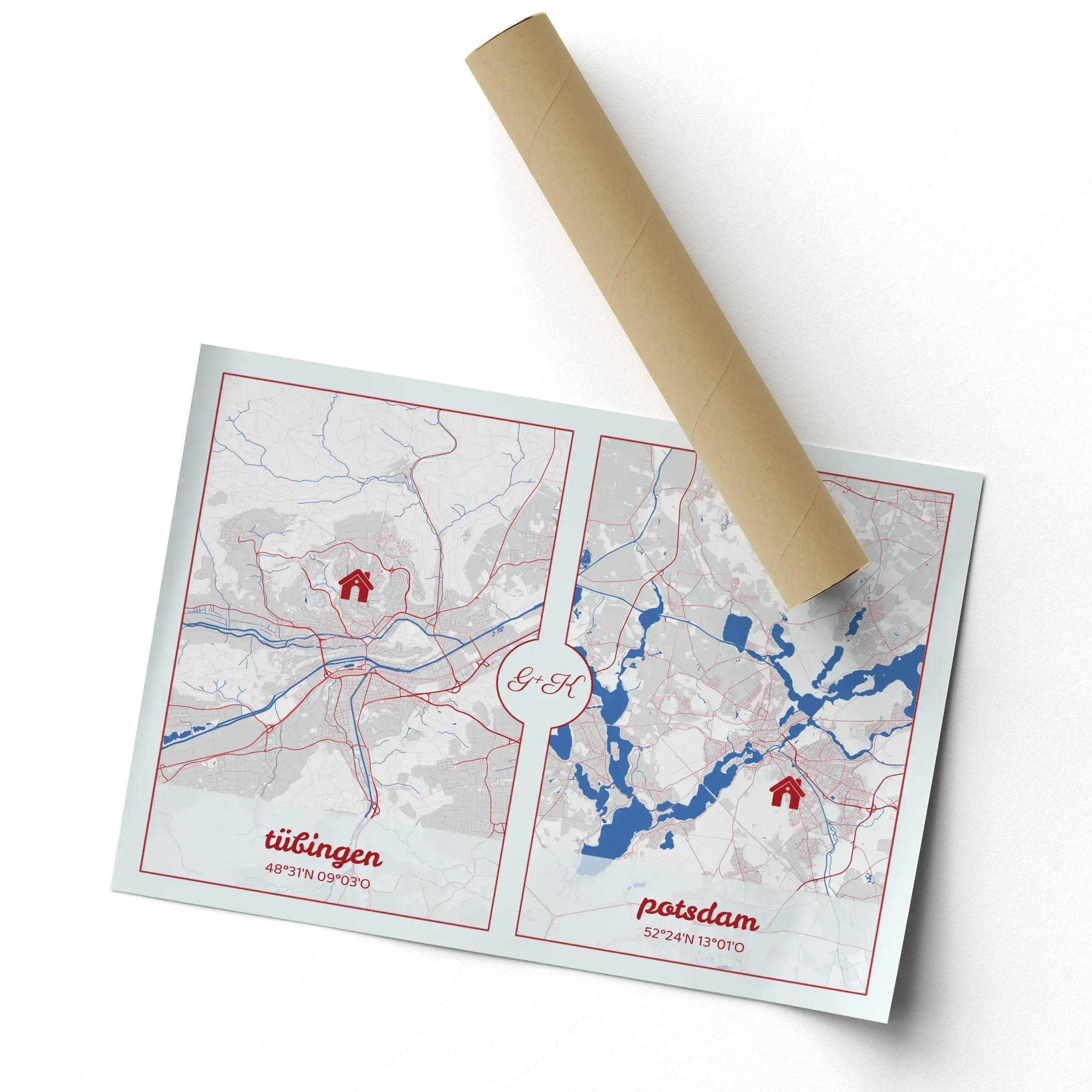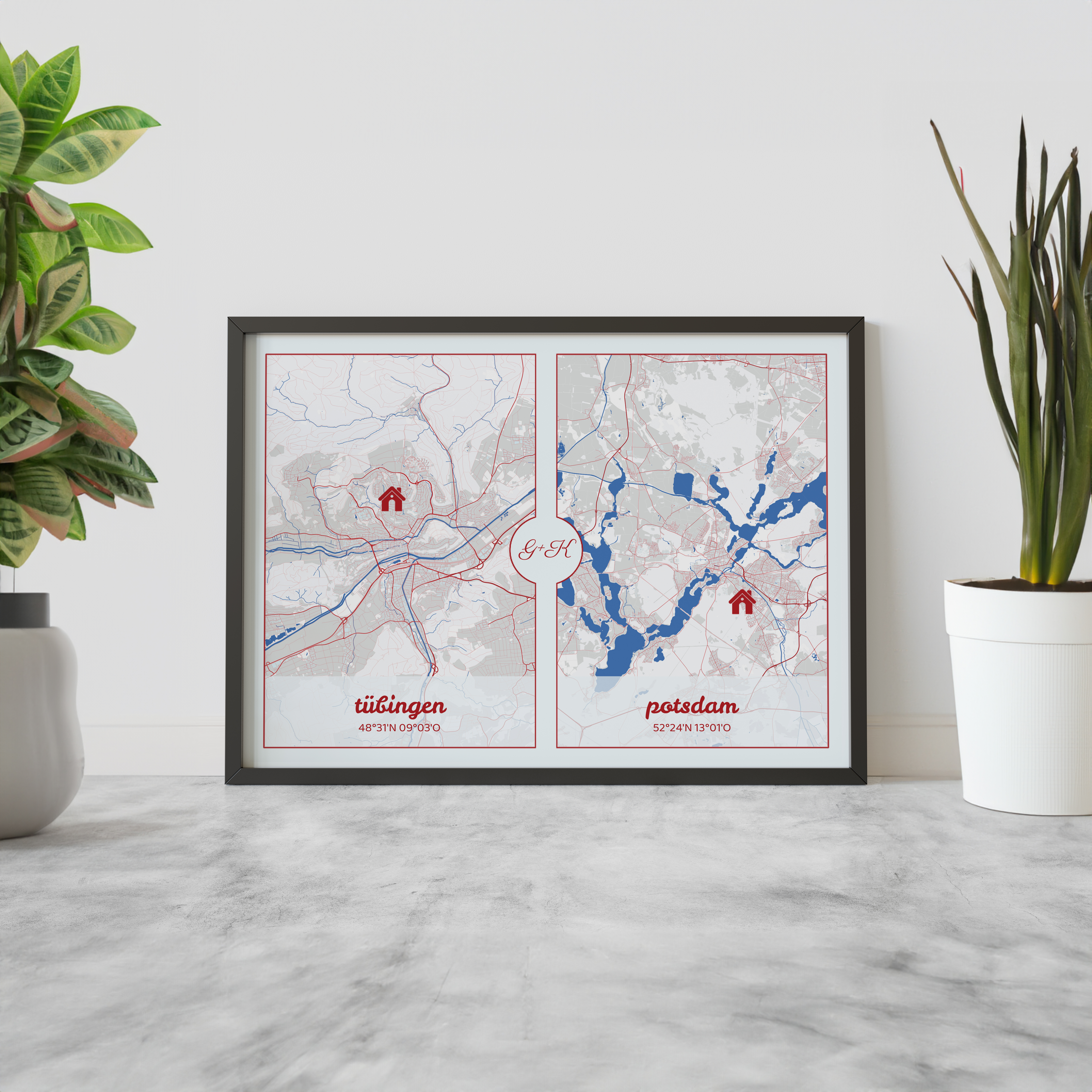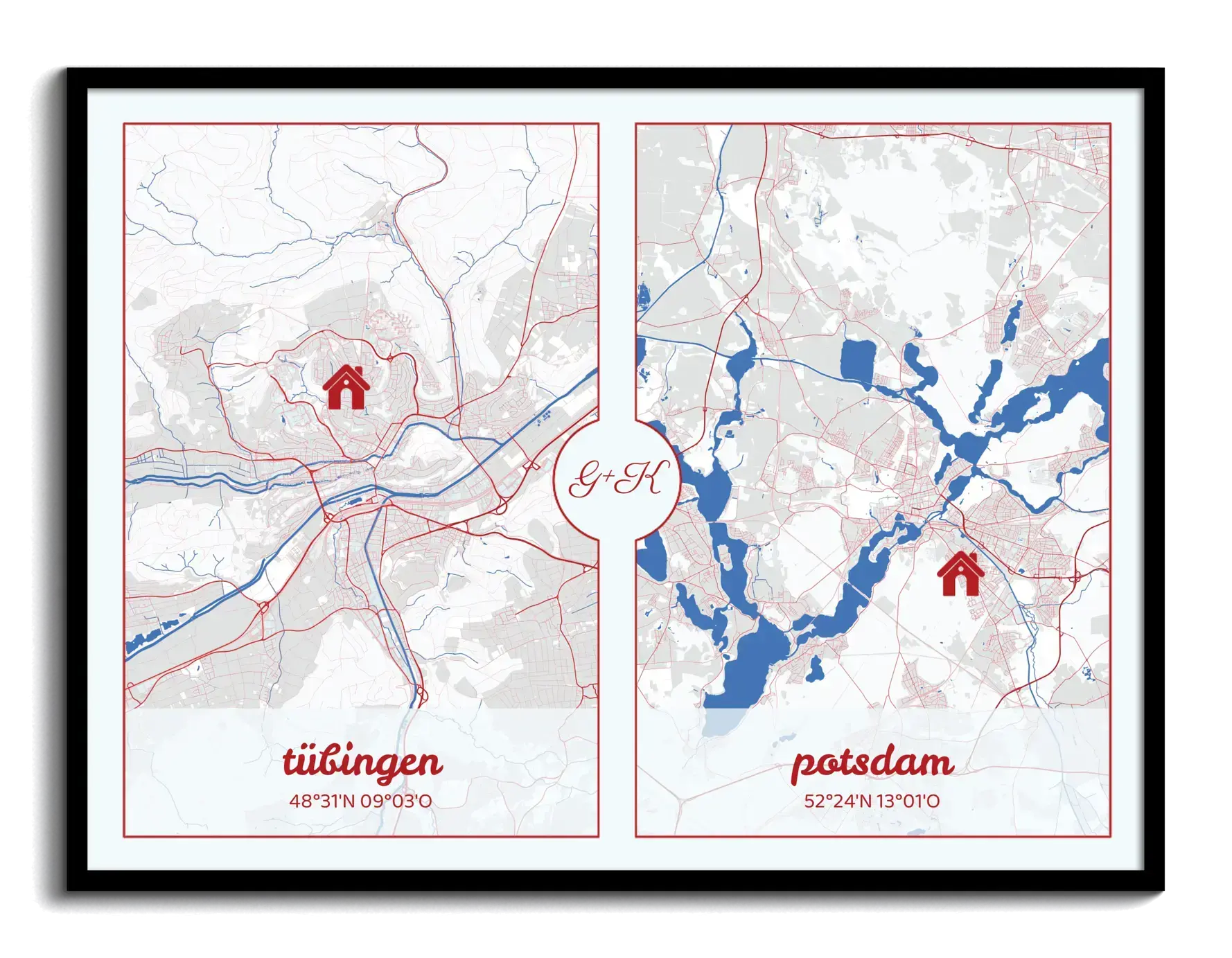 Entdecke die Möglichkeit, deine ganz persönliche Stadtkarte oder dein individuelles Koordinatenposter zu gestalten. Mit unserem Produkt hast du die Freiheit, aus jeder Stadt oder jedem Ort weltweit ein einzigartiges Kunstwerk zu erschaffen. Unser Beispiel zeigt zwei Orte, stilvoll im DOPPEL-Stil mit modernen roten und blauen Linien in Querformat, ideal als Geschenk für Fernbeziehungen. Hierbei sind die Städte Tübingen und Potsdam zu sehen, verbunden durch ein dekoratives &-Symbol und personalisierten Initialen.