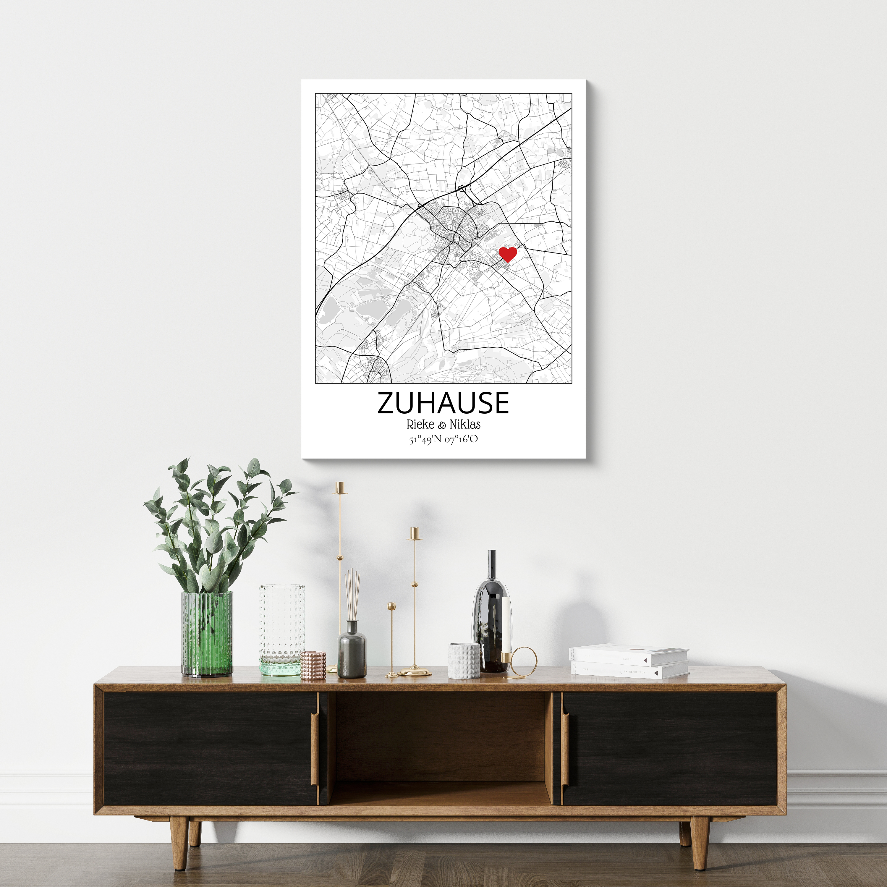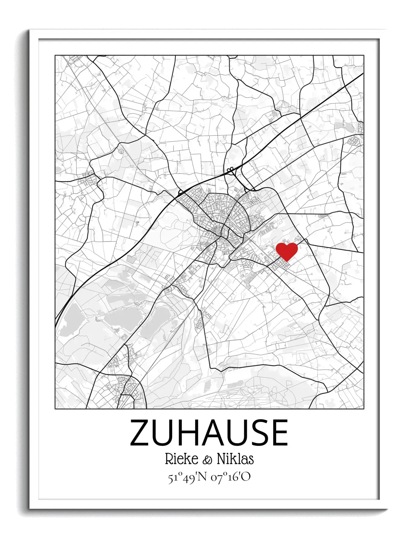 Zeige deine Liebe mit einer personalisierten Karte eures gemeinsamen Zuhauses! Markiert euren besonderen Ort mit einem Herz und fügt eure Namen hinzu für eine liebevolle, einzigartige Erinnerung.