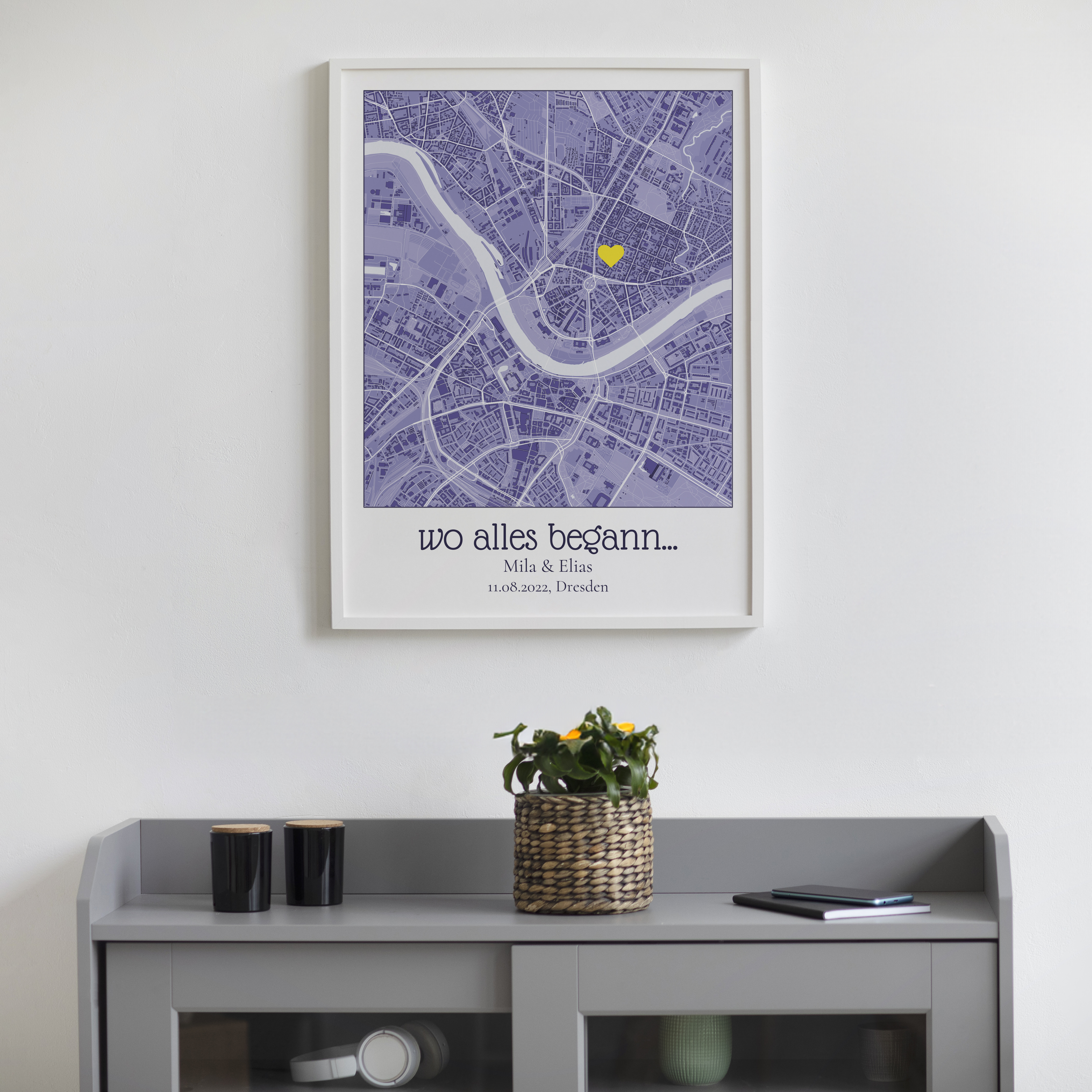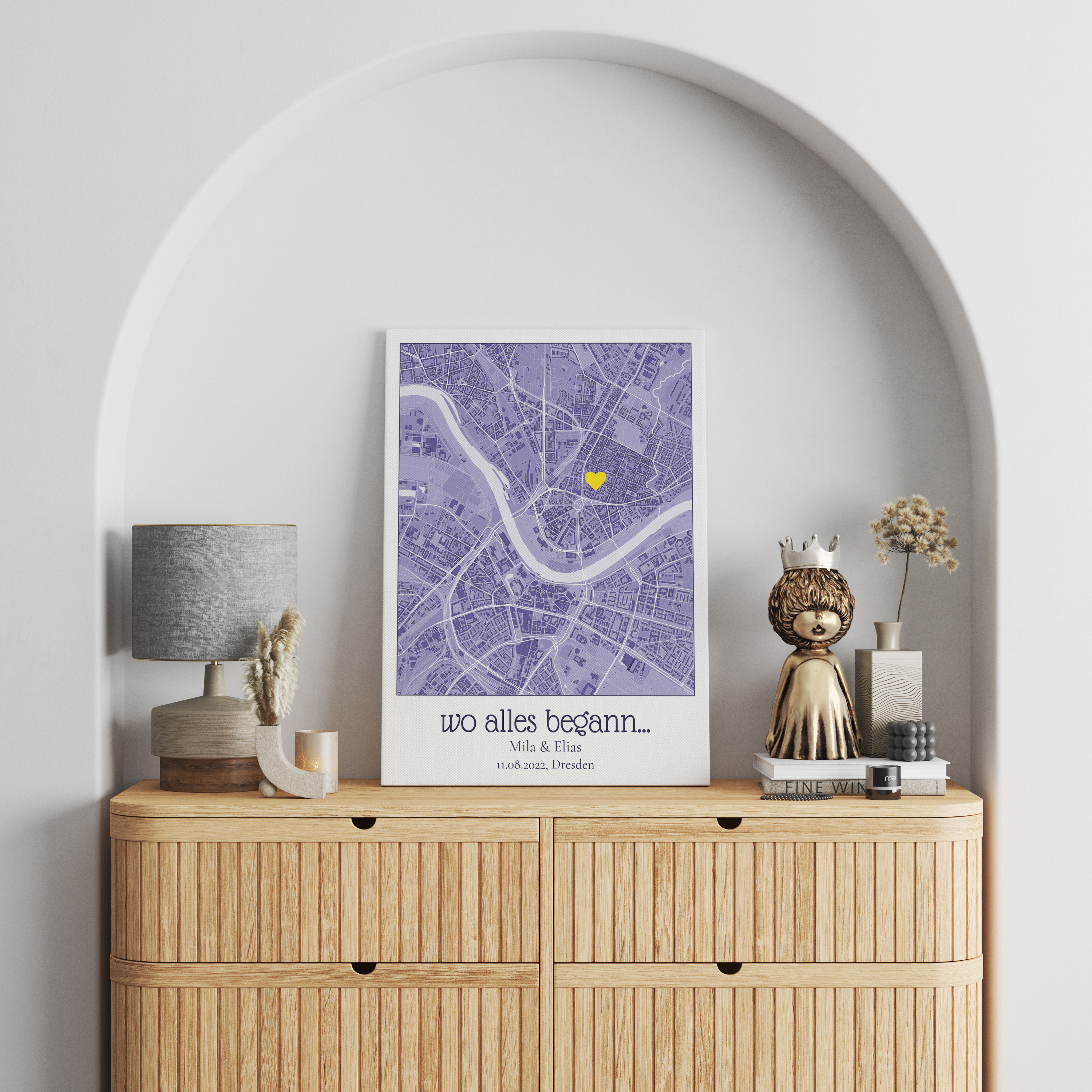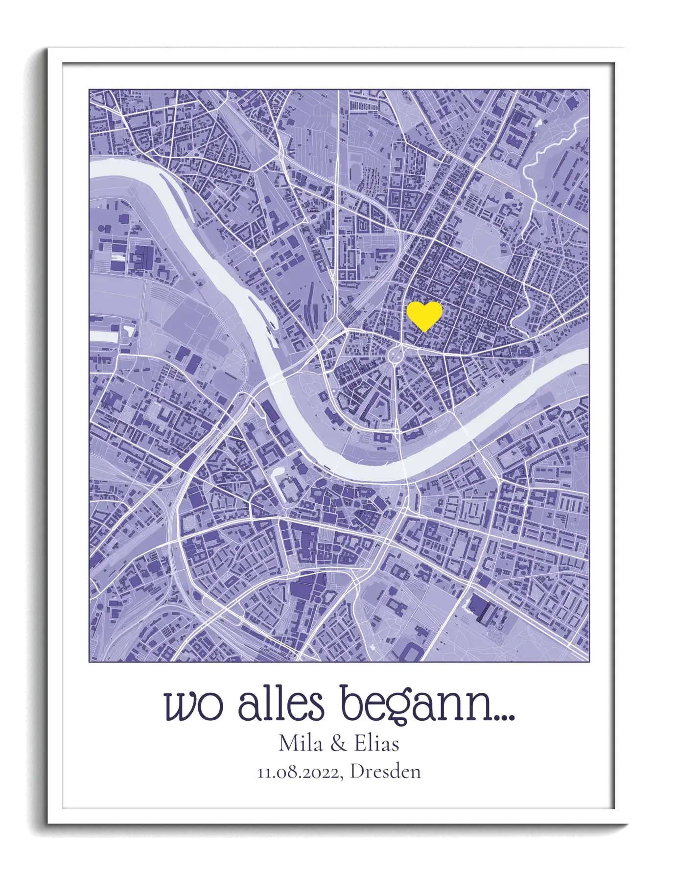 Erstelle deine eigene personalisierte Karte und schenke einem geliebten Menschen oder dir selbst eine bleibende Erinnerung an einen besonderen Ort oder Moment. Unsere personalisierte Landkarte „Wo alles begann“ zeigt eine stilisierte Karte von Dresden, ergänzt mit persönlichen Details wie Namen, Datum und einem speziellen Marker. Als perfektes Geschenk für Paare, Freunde oder Familie bietet diese Karte emotionale Bedeutung und Stil für jeden Raum.