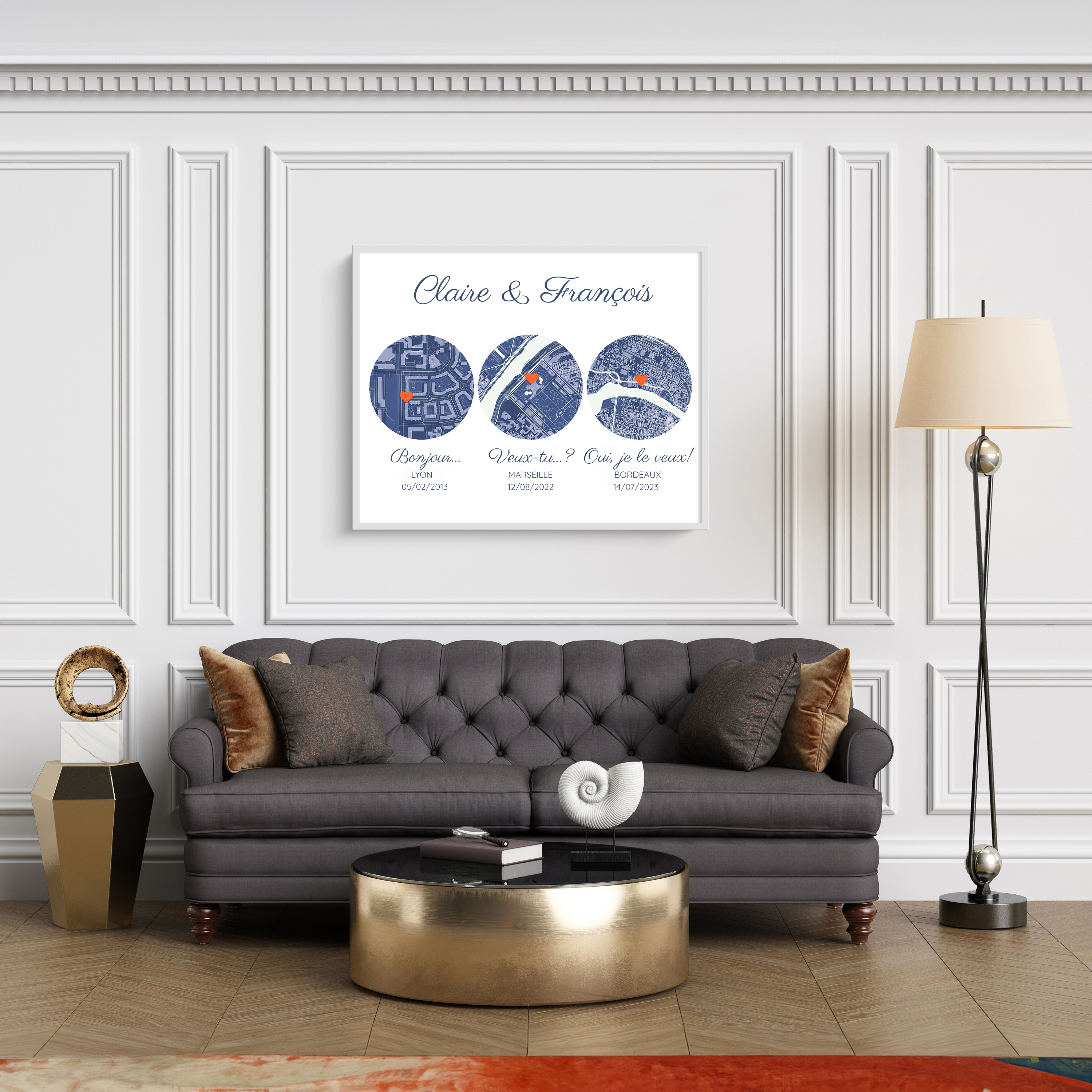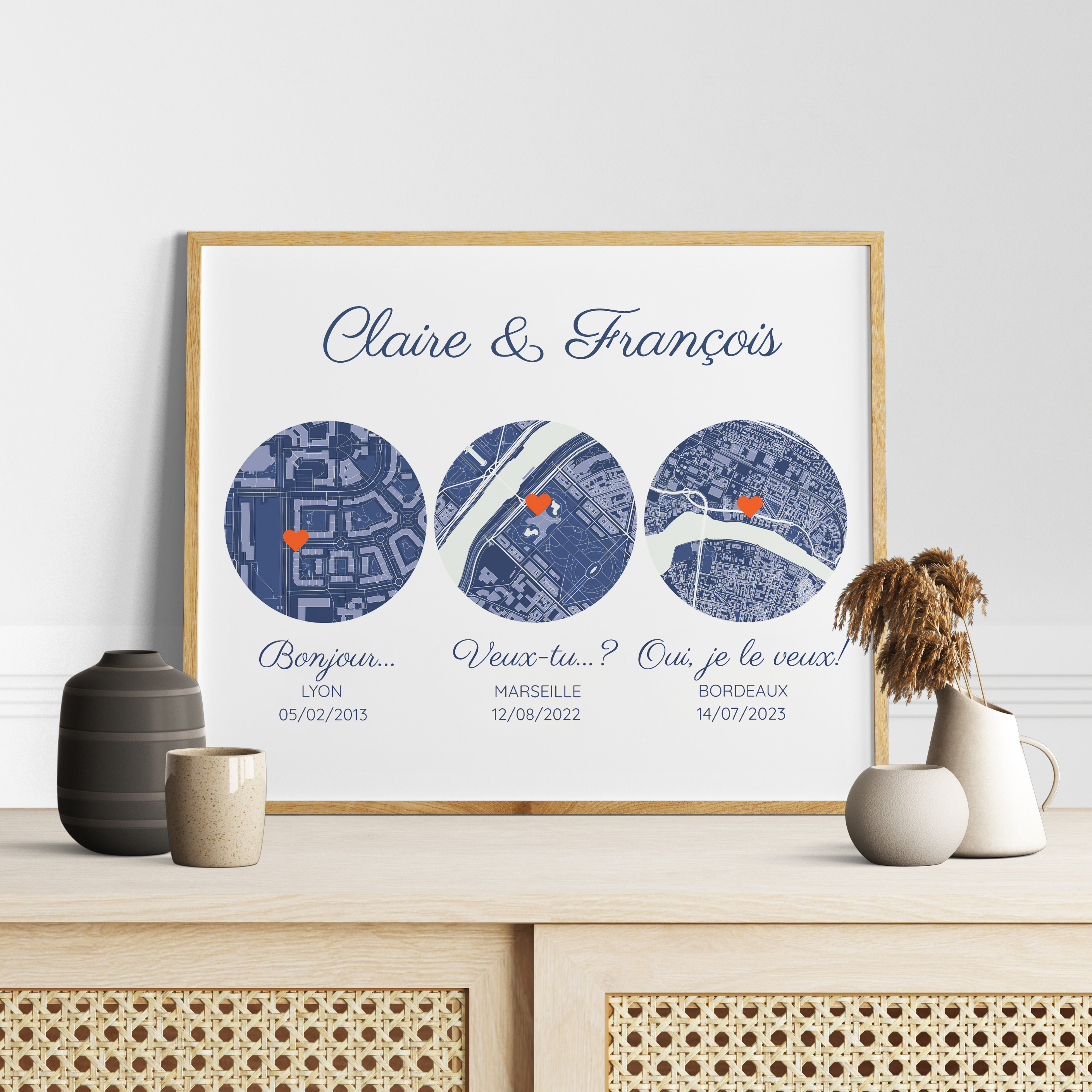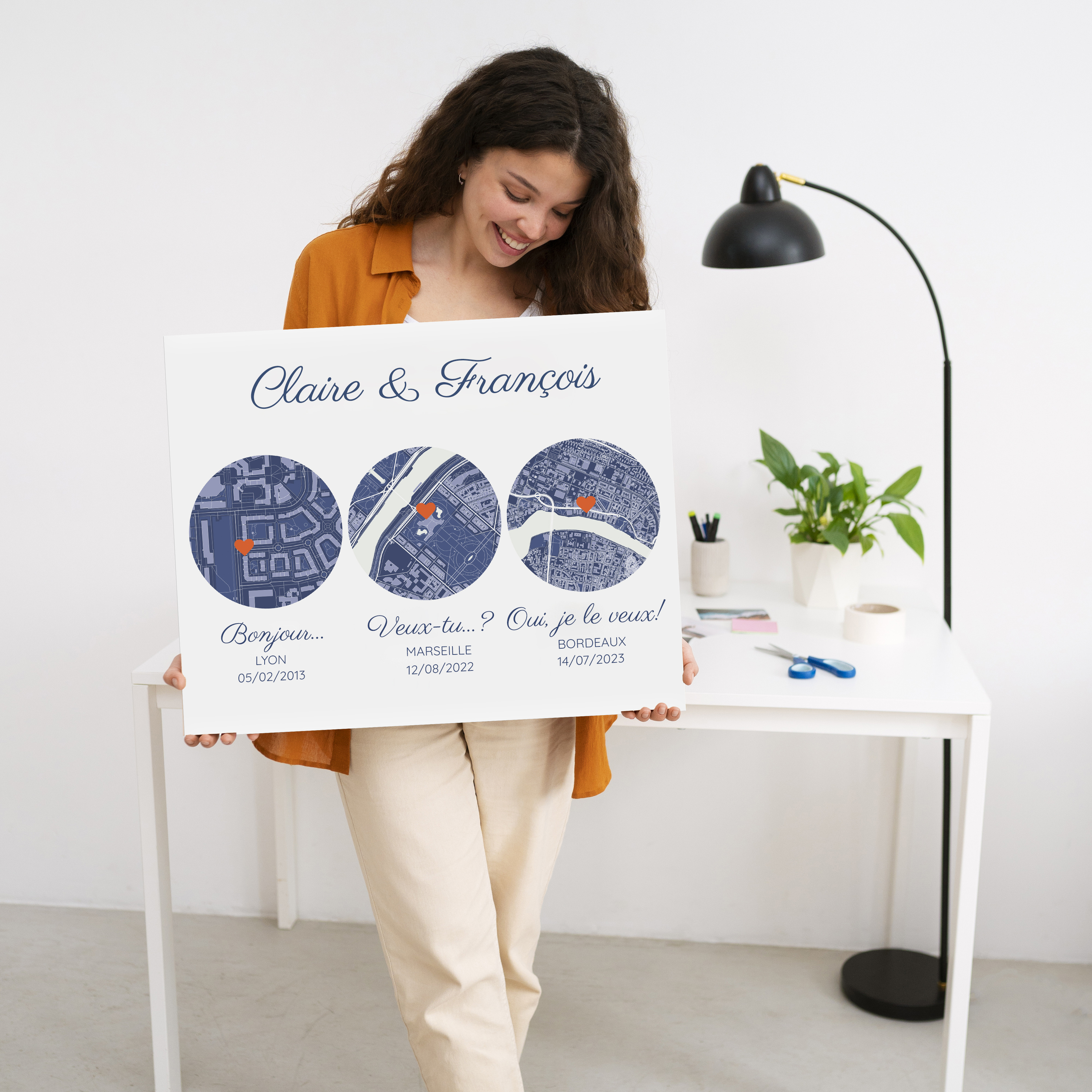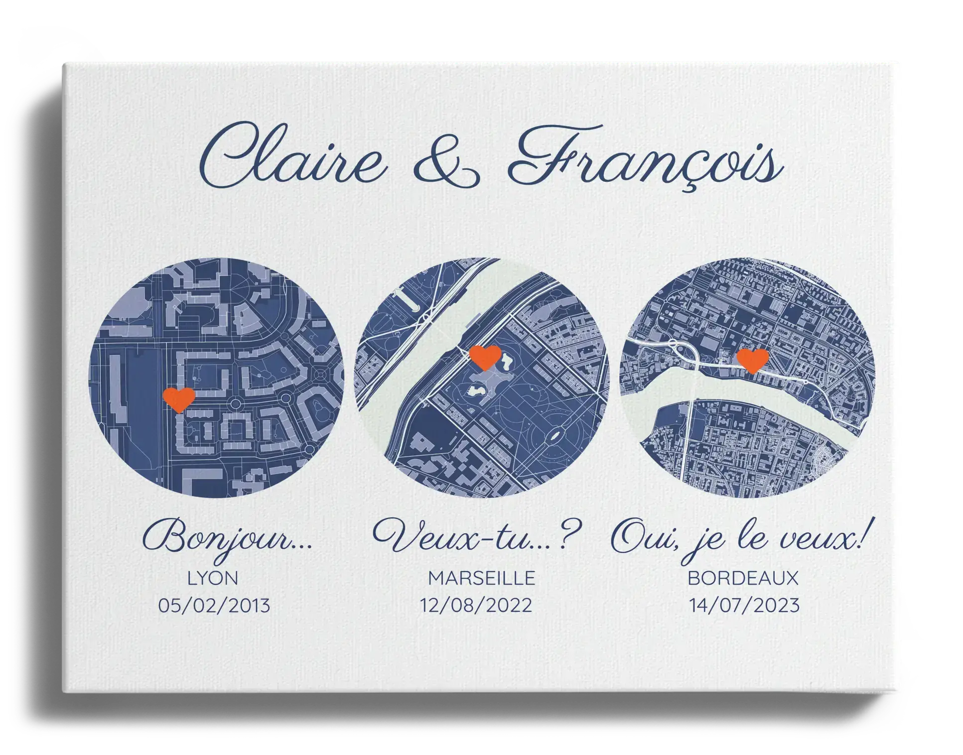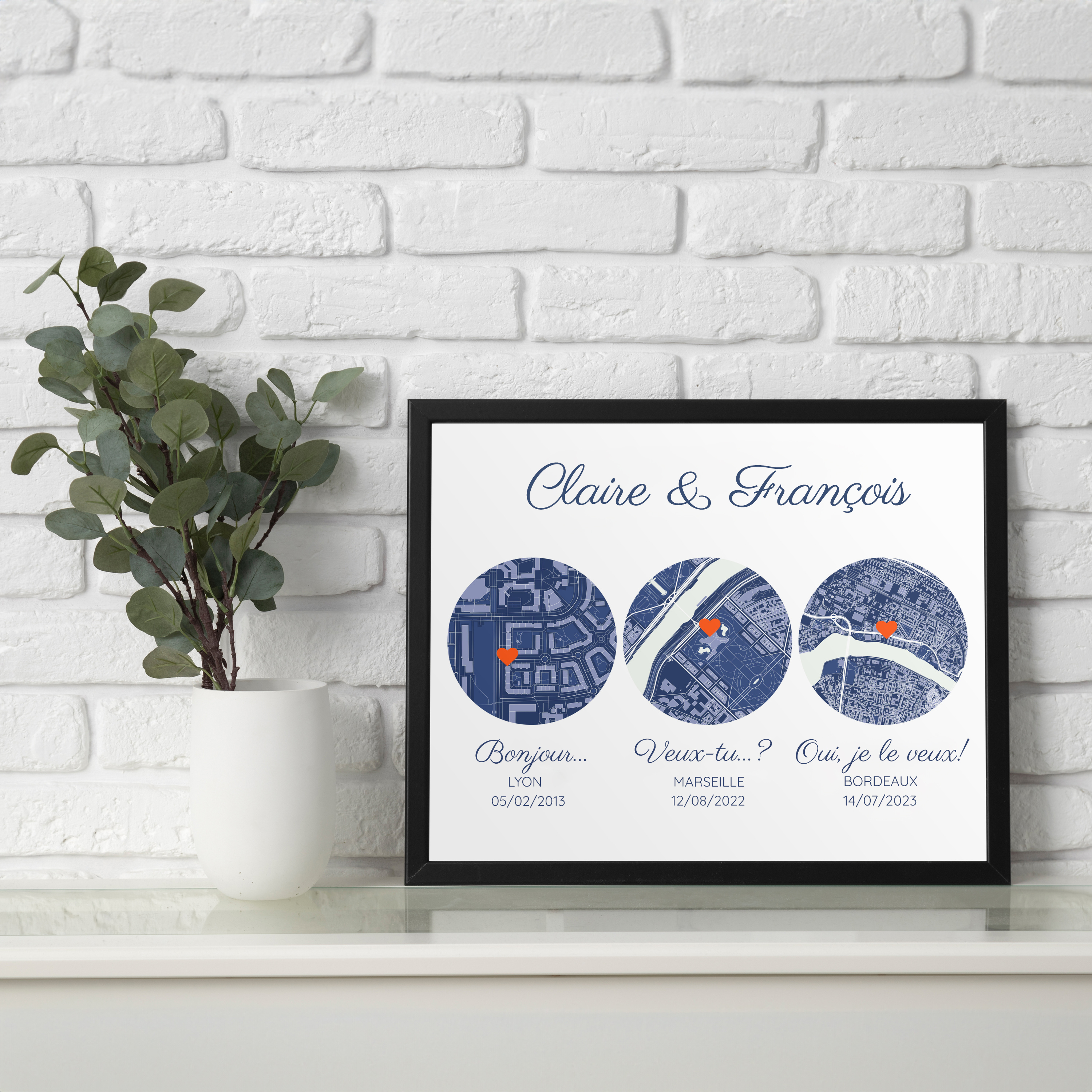Cadeau personnalisé pour capturer trois moments uniques : rencontre, engagement, mariage.