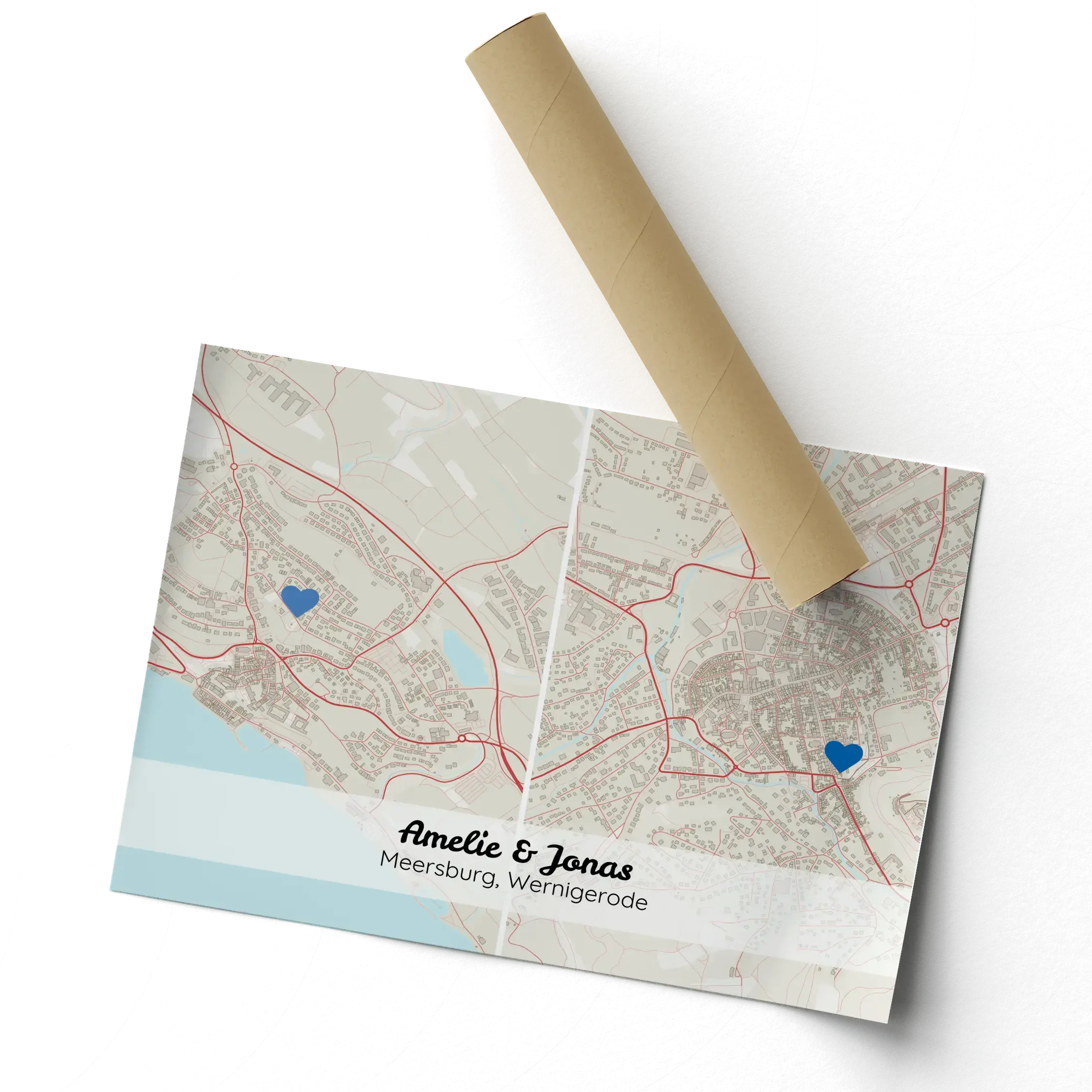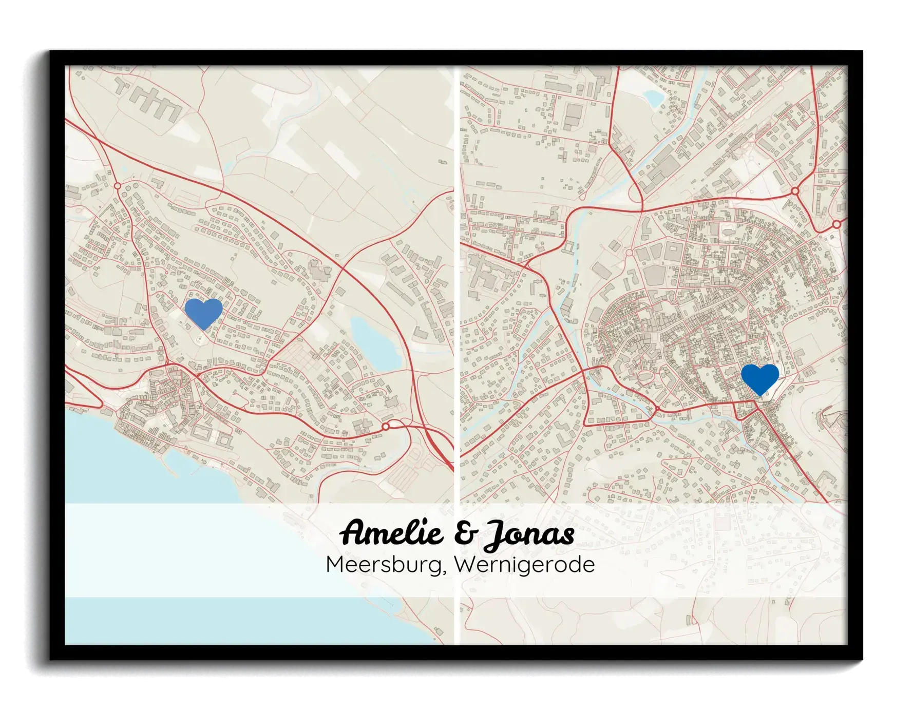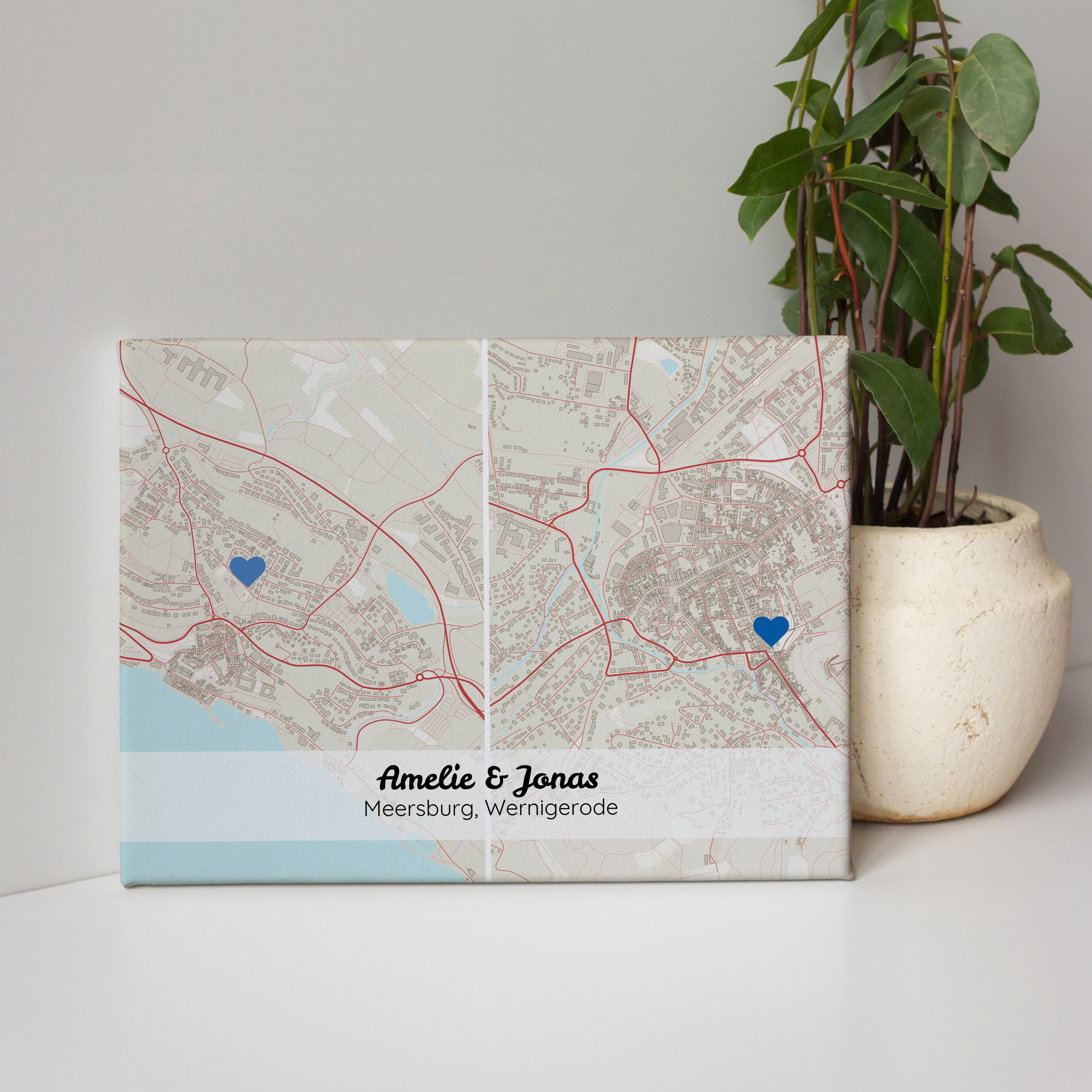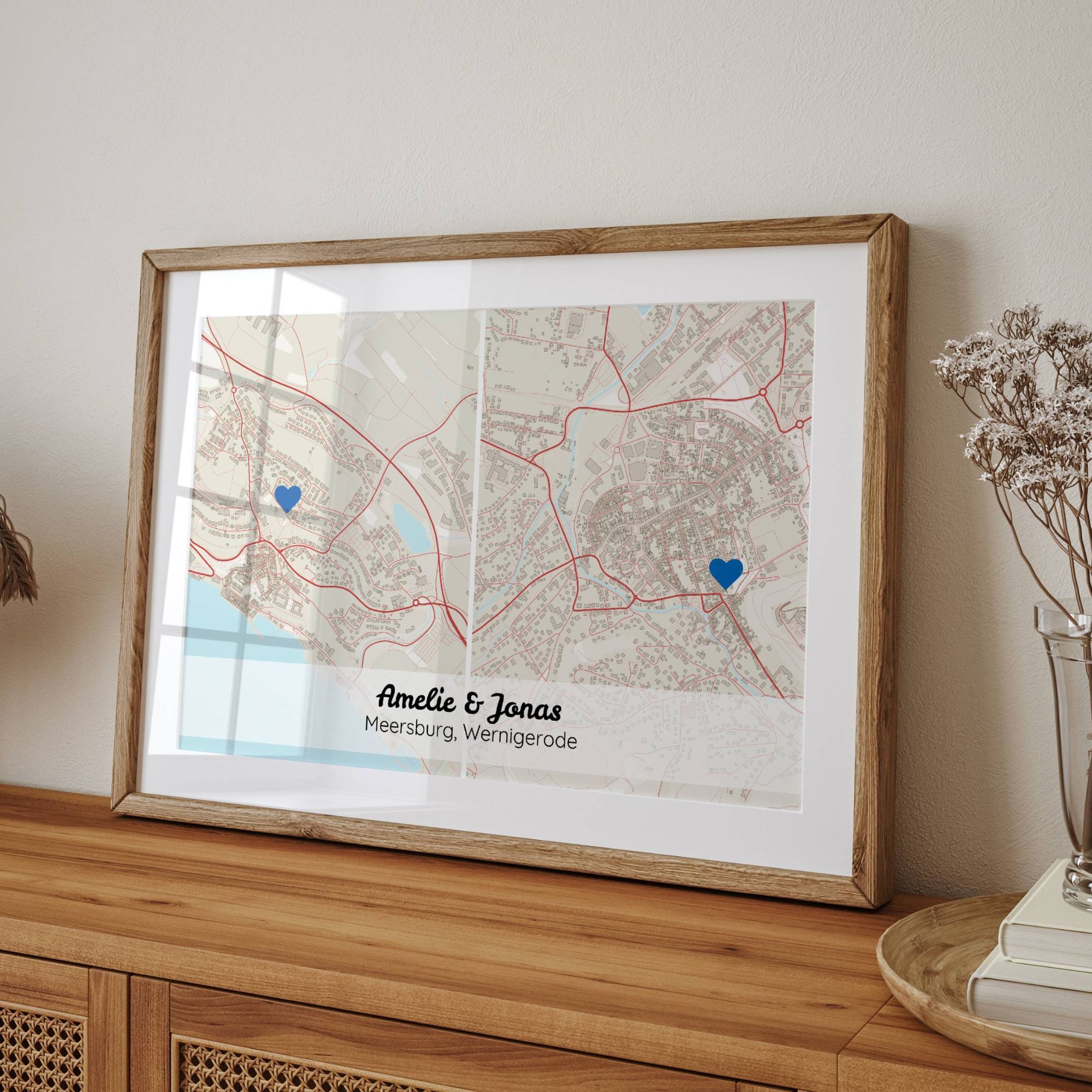 Transformez votre espace avec une carte personnalisée unique en son genre. Imaginez une carte en format paysage affichant côte à côte deux lieux significatifs, soulignés par des marqueurs personnalisés comme un cœur. Ajoutez-y vos touches personnelles avec des noms et des détails de localisation. Un cadeau idéal pour les couples vivant dans des villes différentes ou souhaitant capturer des moments précieux de leur relation. Parfait pour embellir un mur ou pour célébrer des occasions spéciales comme des anniversaires de mariage ou la Saint-Valentin.