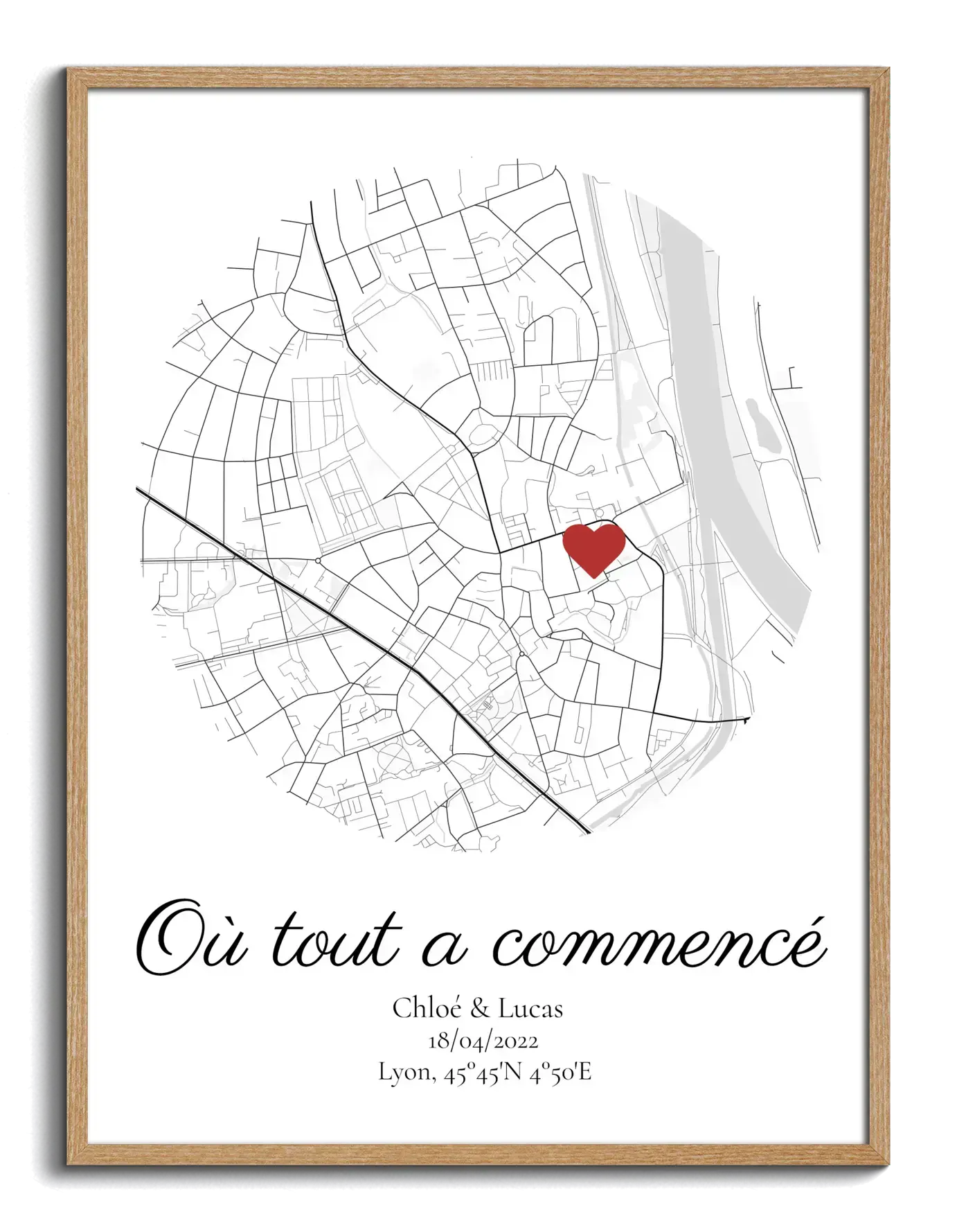 Carte de ville personnalisée "Où tout a commencé", pour célébrer des moments précieux en couple.