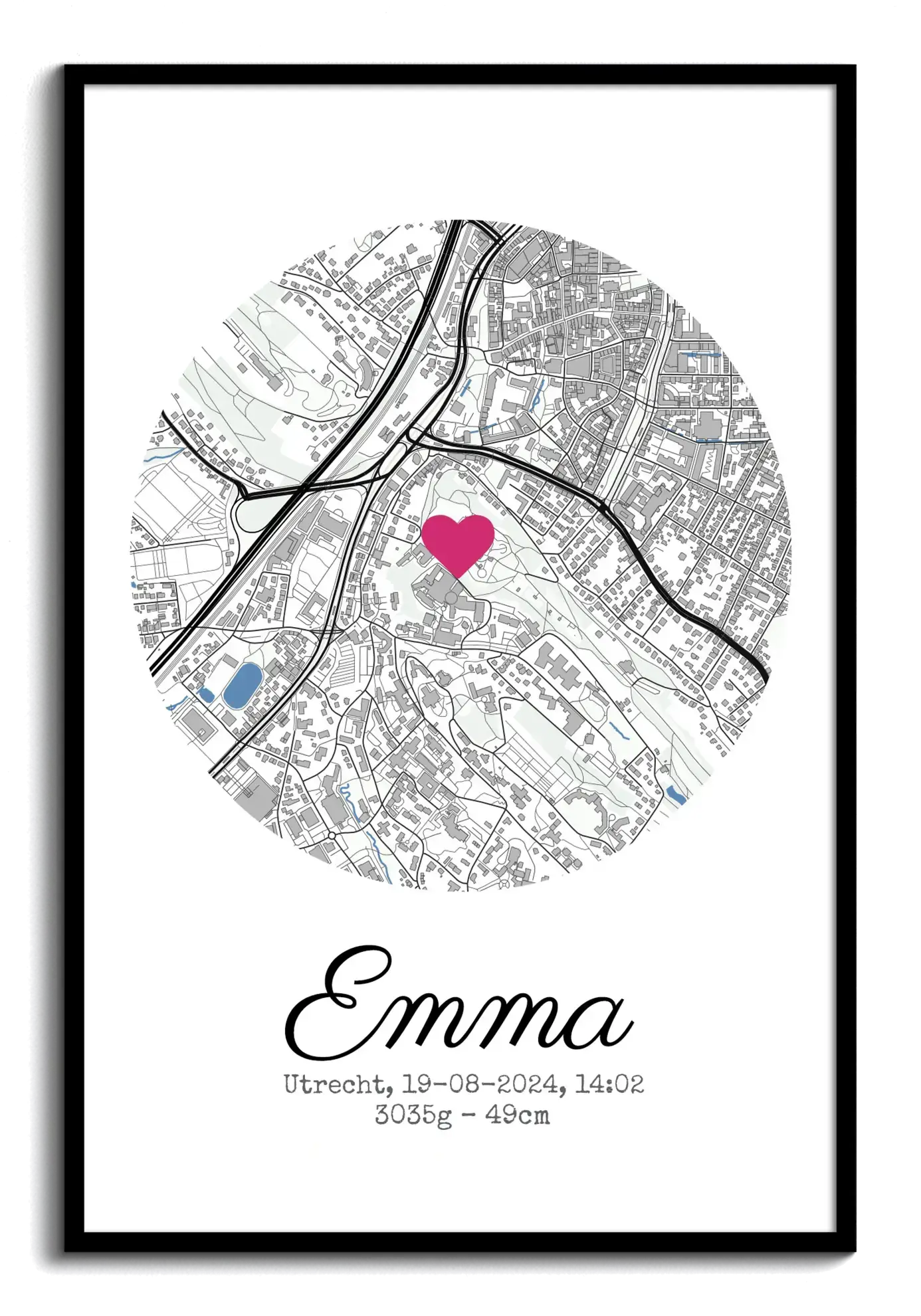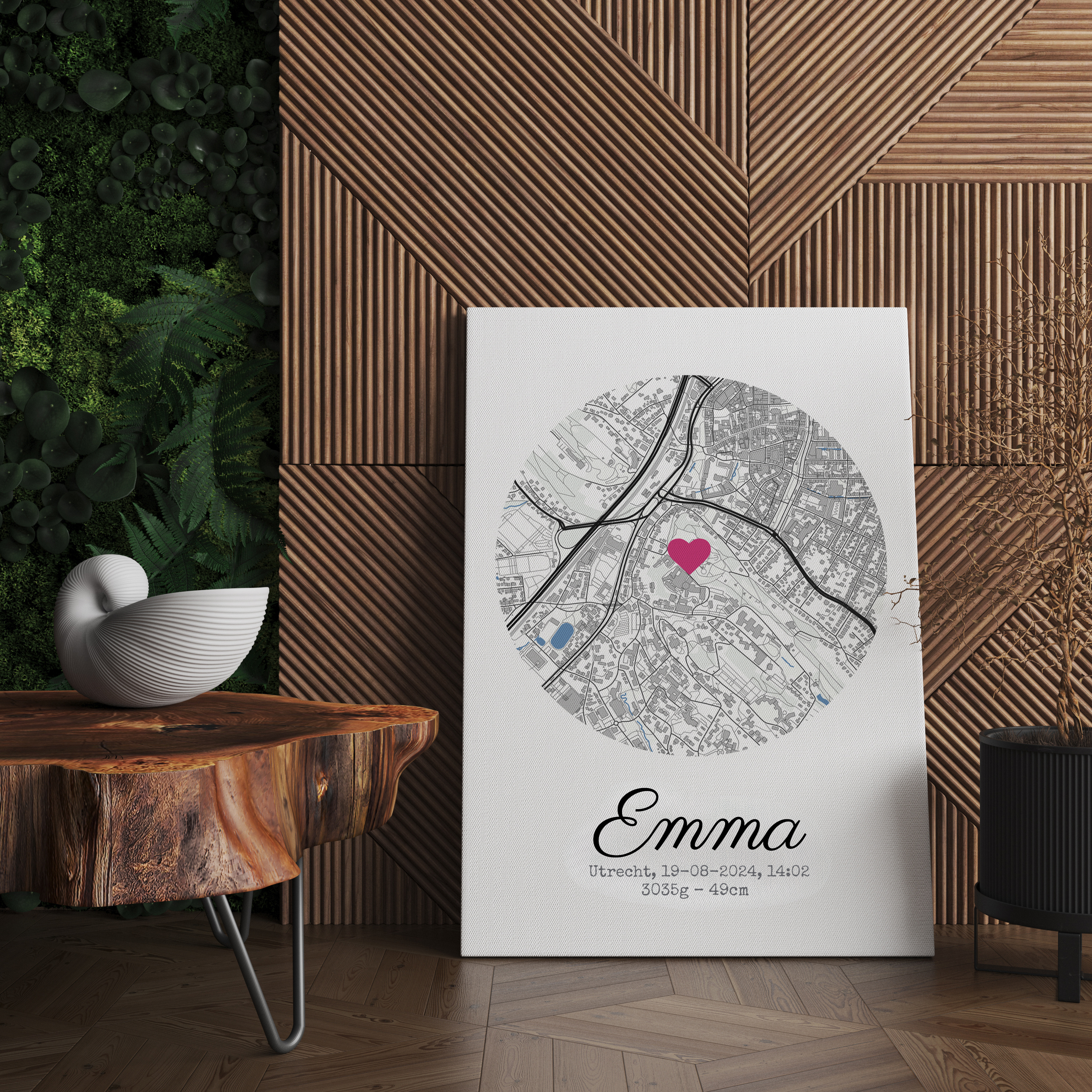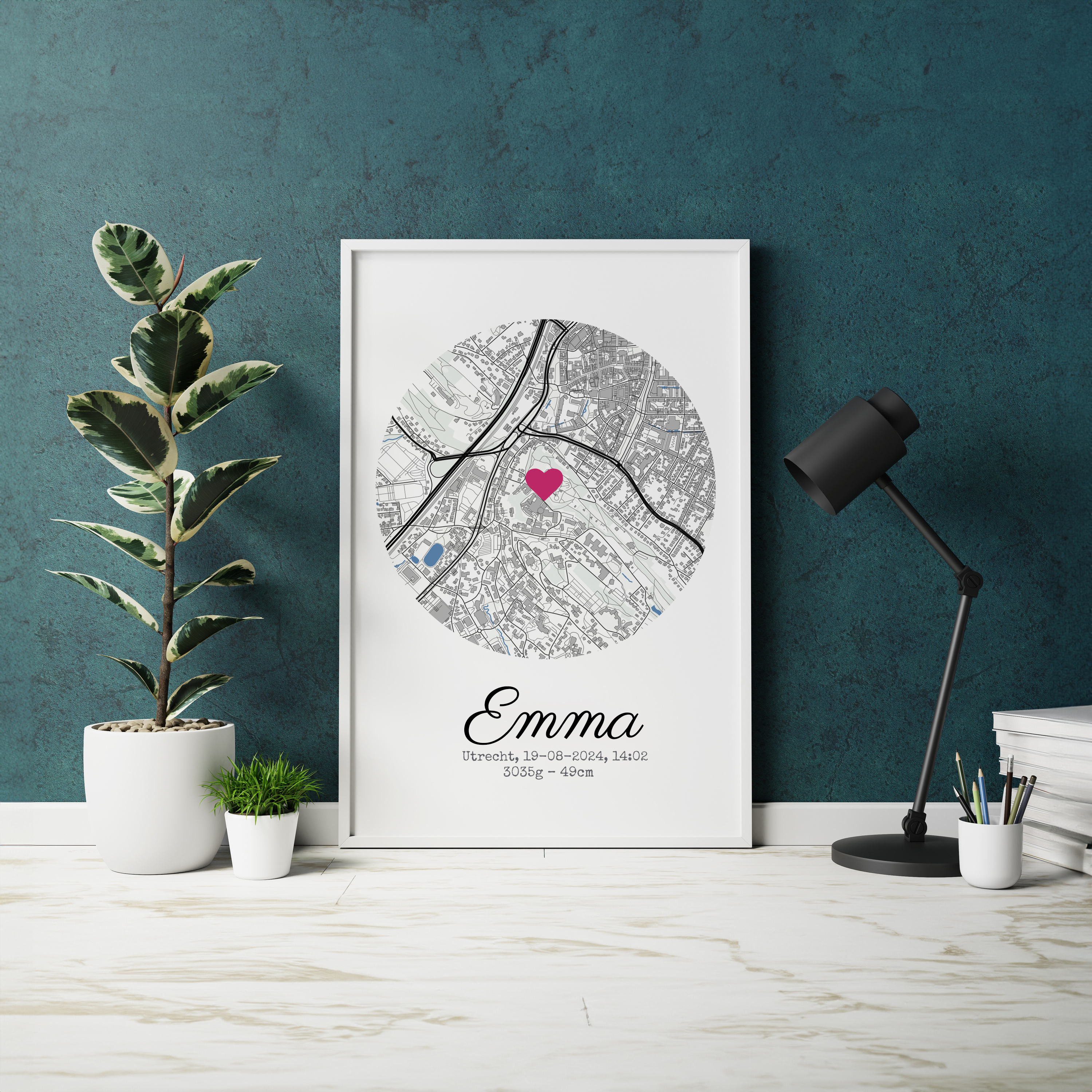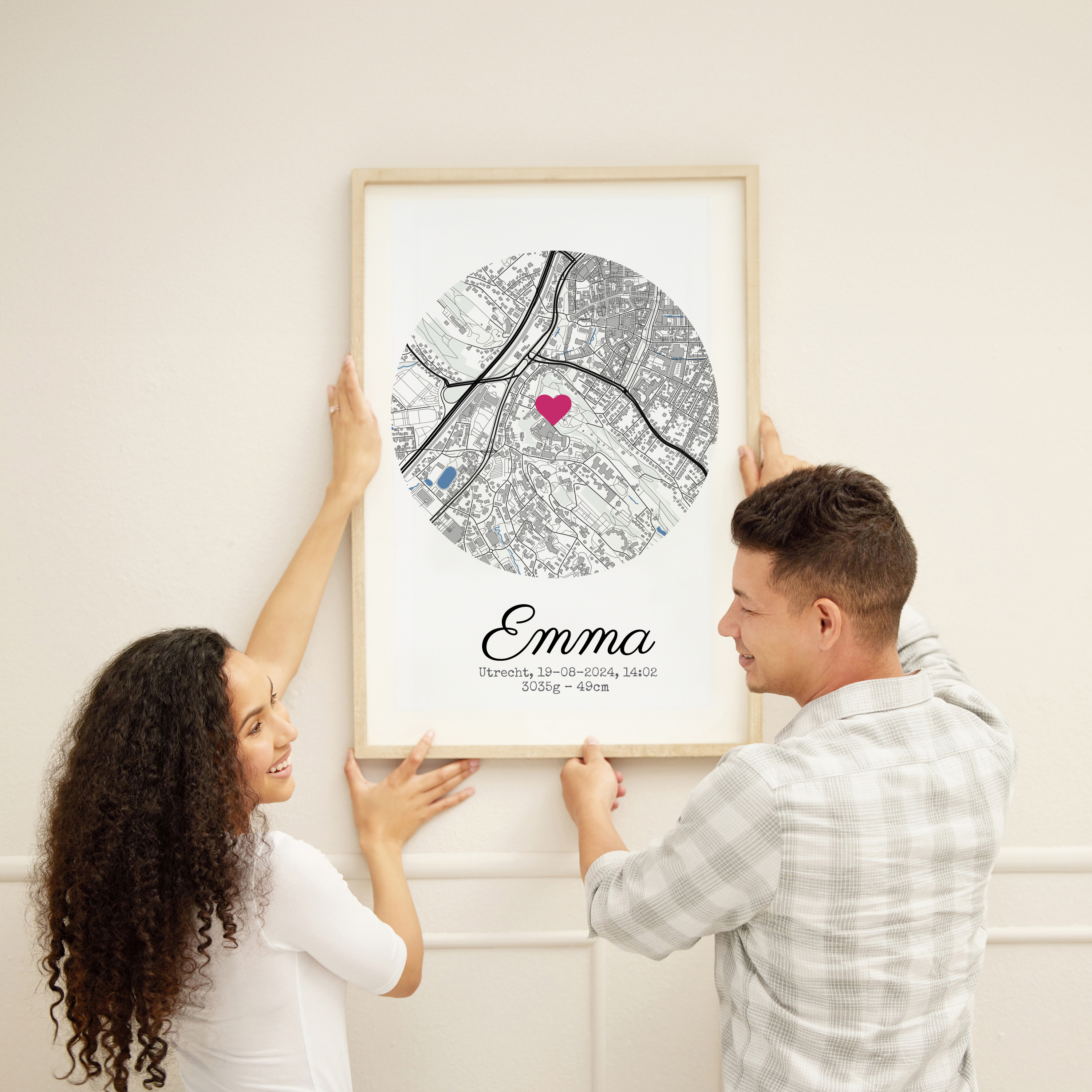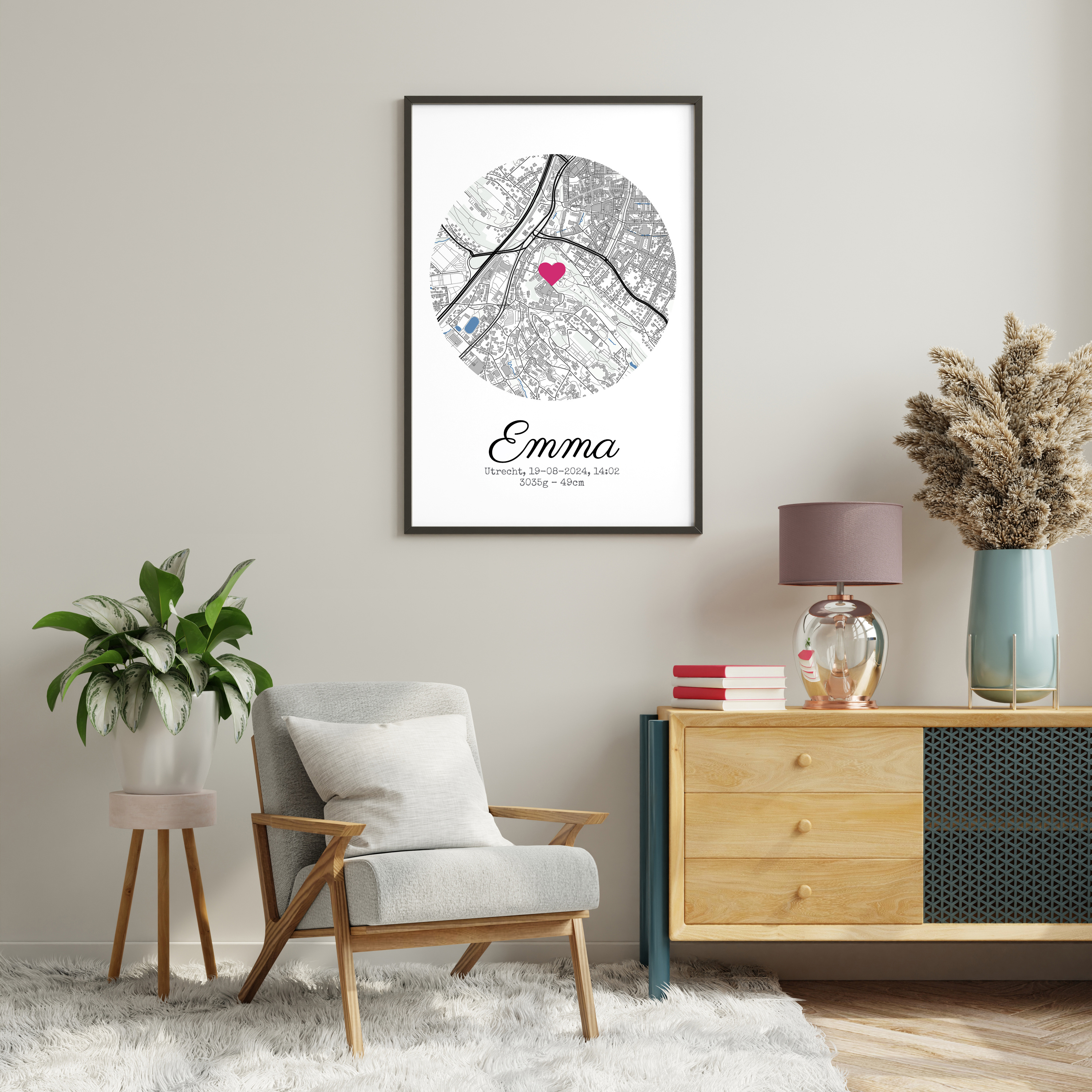 Ontwerp je eigen persoonlijke stadsposter of coördinatenposter en geef een unieke draai aan je interieur. Creëer een geboorteposter met alle belangrijke details: de naam van je kind, geboortedatum, geboortetijd, gewicht, lengte en de geboorteplaats. Dit is het perfecte cadeau voor ouders, grootouders of vrienden en een prachtig accent voor de babykamer. Alle teksten en designelementen kun je geheel naar eigen wens aanpassen.