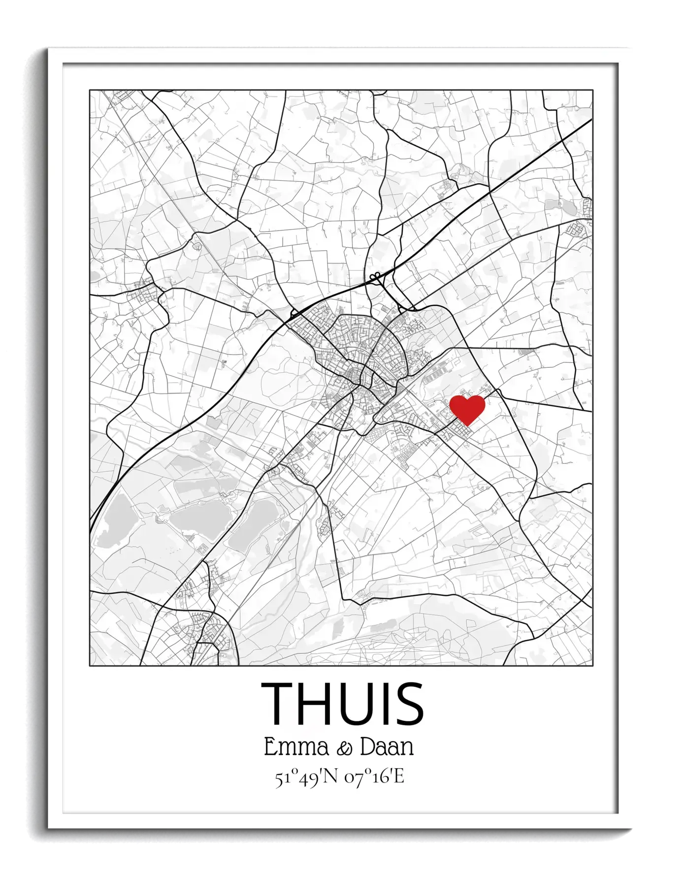 De ontwerpmogelijkheden zijn eindeloos. Of je nu een minimalistisch ontwerp wilt of iets levendigs, alles is mogelijk. Voeg persoonlijke details toe zoals titels, datums of belangrijke momenten. Markeer speciale plekken op je kaart met symbolen zoals hartjes of sterren en creëer een uniek kunstwerk dat jouw verhaal vertelt.