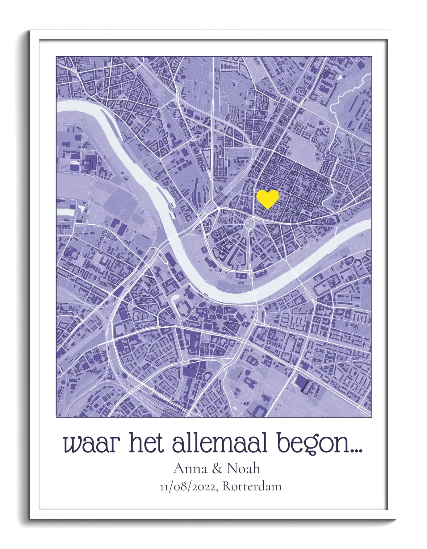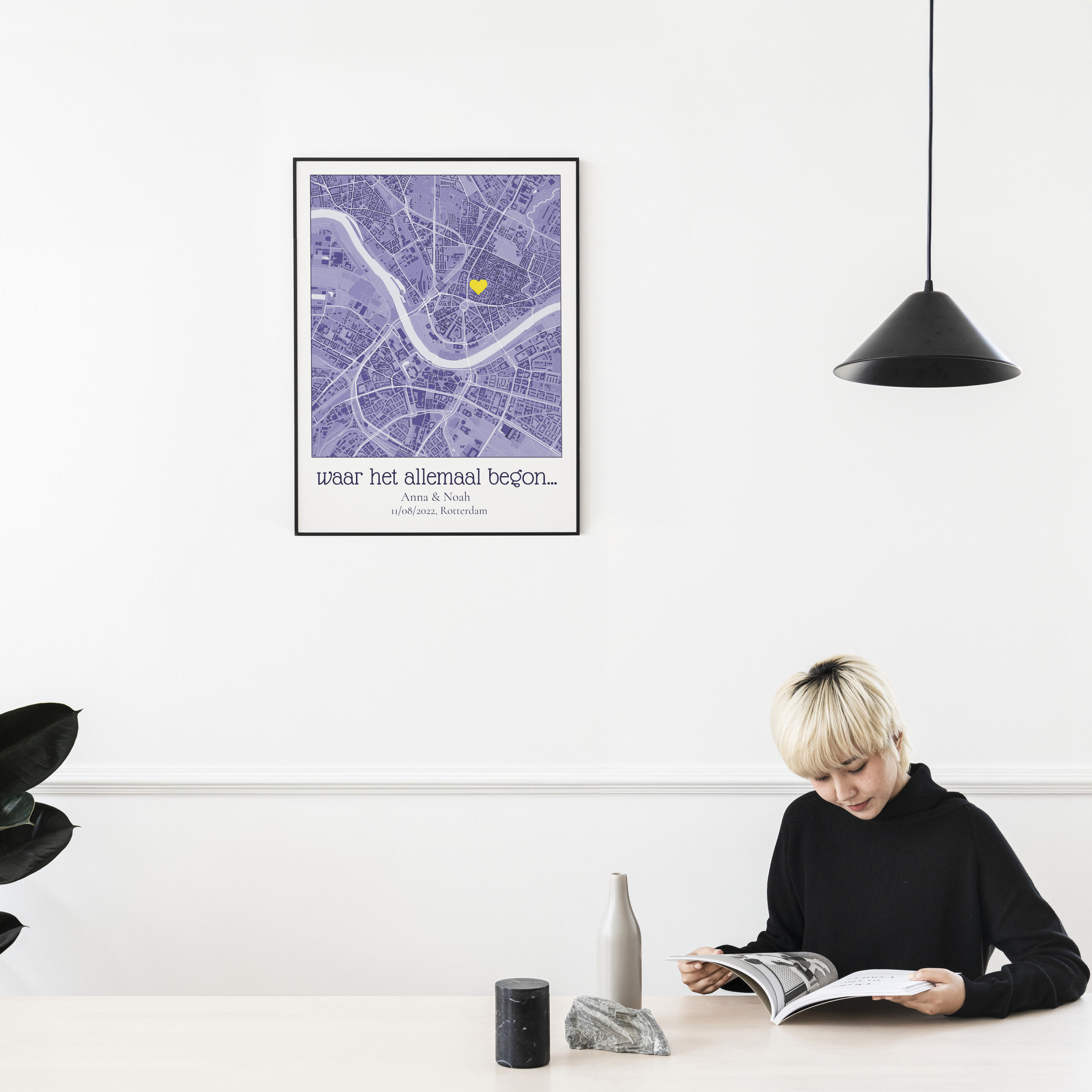 Het maken van jouw gepersonaliseerde kaart is eenvoudig. Kies een adres of locatie en pas het aan door in te zoomen en te verschuiven. Selecteer vervolgens een stijl en kleur die jouw voorkeur hebben en voeg persoonlijke teksten toe. Als laatste kun je belangrijke plekken markeren met een symbool naar keuze en jouw bestelling plaatsen.
