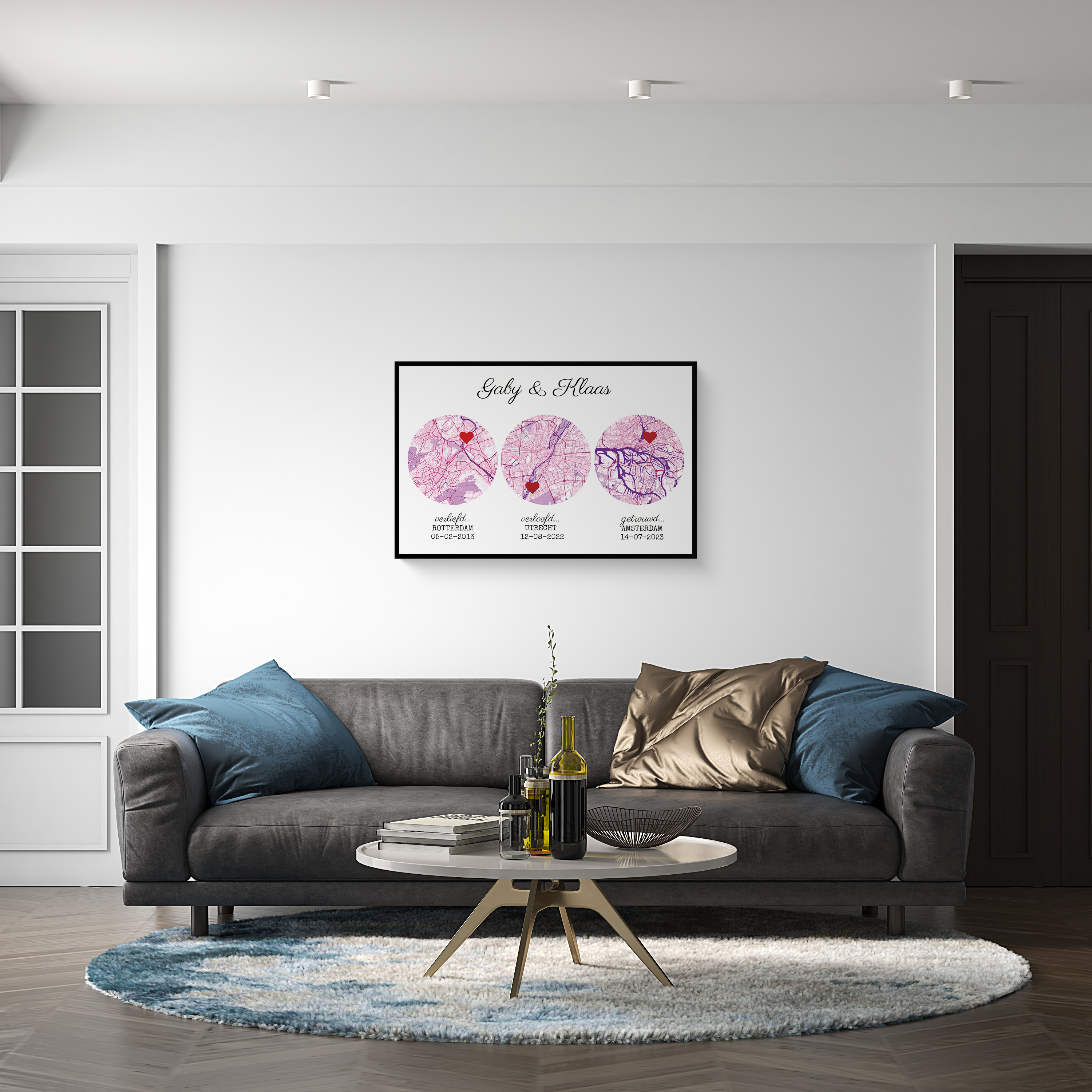Stel je voor dat je een binnen je relatie bijzondere momenten kunt vereeuwigen met een persoonlijke touch. Creëer een gepersonaliseerde stadskaart of coördinatenposter van je favoriete plekken ter wereld. Met dit prachtige voorbeeld kun je een uniek kunstwerk maken met drie bijzondere locaties gemarkeerd met de symbolische woorden verliefd verloofd en getrouwd. Perfect als betekenisvol cadeau voor jezelf of voor een speciaal stel.
