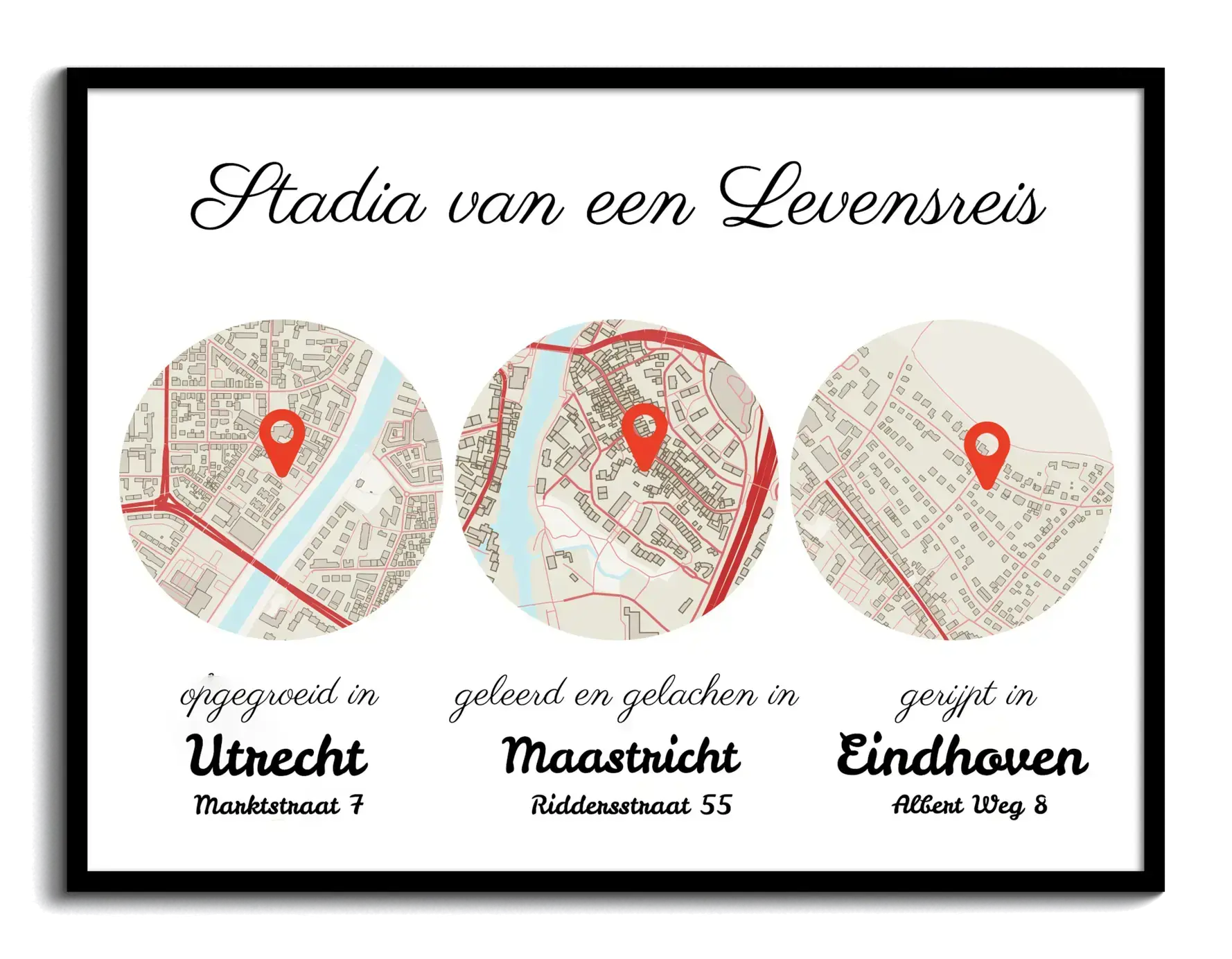 Personalisierte levenswegkaart: markeer belangrijke levensstadia met unieke teksten en locaties.